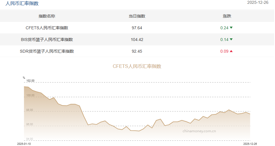 新华财经北京12月29日电 中国外汇交易中心最新计算的2025年12月26日CFETS人民币汇率指数为97.64,按周跌0.24%;BIS货币篮子 人民币汇率指数报104.42,按周跌0.14%;SDR货币篮子人民币汇率指数报92.45,按周涨0.09%。 上周(12月22-26日),圣诞节当周市场流动性明显较弱,美元指数重新回到98附近盘整;人民币兑美元汇率于周一至周四持续上 涨,周五高位震荡。具体数据显示,在岸人民币兑美元累计上涨325个基点报7.0085,离岸人民币累计上涨297点报7.0045,人民币对 美元中间价累计调升192个基点报7.0358。 国内方面:中国人民银行发布《中国金融稳定报告(2025)》。其中提到,保持流动性充裕,使社会融资规模、货币供应量增长同 经济增长、价格总水平预期目标相匹配,持续营造适宜的货币金融环境。推动社会综合融资成本下降。坚持市场在汇率形成中的决 定性作用,保持汇率弹性,强化预期引导,防范汇率超调风险,保持人民币汇率在合理均衡水平上的基本稳定。 为加强人民币跨境支付系统(CIPS)业务管理,央行修订《人民币跨境支付系统业务规则》,自2026年2月1日起施行。规则指出 ...