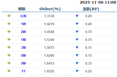 新华财经北京11月6日电(高二山)人民银行6日开展928亿元7天期逆回购操作,操作利率为1.40%,与此前持平;鉴于当日有3426亿元7 天期逆回购到期,公开市场实现净回笼2498亿元。 上海银行间同业拆放利率(Shibor)短期品种均微跌,延续窄幅震荡。具体来看,隔夜Shibor下跌0.20BP,报1.3130%;7天Shibor下跌 0.20BP,报1.4210%;14天Shibor下跌0.70BP,报1.4540%。 | | | | 2025-11-06 11:00 | | --- | --- | --- | --- | | | 期限 | Shibor(%) | 涨跌(BP) | | t | O/N | 1.3130 | 0.20 | | � | 1W | 1.4210 | 0.20 | | f | 2W | 1.4540 | 0.70 | | 鲁 | 1M | 1.5340 | 0.75 | | t | 3M | 1.5875 | 0.15 | | � | 6M | 1.6240 | 0.15 | | f | 9M | 1.6415 | 0.35 | | t | 1Y | 1.6525 | 0.25 ...