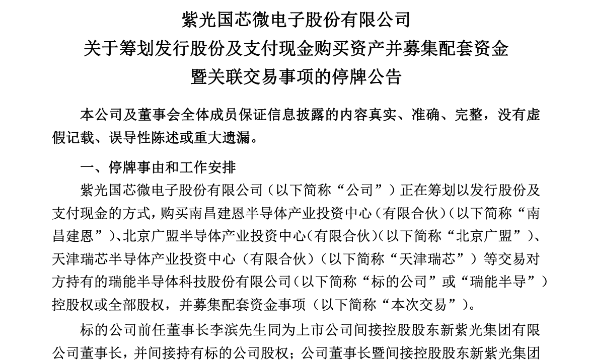 2025年行将结束之际,新紫光集团旗下紫光国微(002049)(002049.SZ)一纸公告,让半导体行业年末最引人瞩目的一桩并购浮出水面。 12月29日晚,紫光国微公告披露,正在筹划以发行股份及支付现金的方式,购买南昌建恩半导体产业投资中心(有限合伙)(下称"南昌建恩")、北京广盟 半导体产业投资中心(有限合伙)(下称"北京广盟")、天津瑞芯半导体产业投资中心(有限合伙)(下称"天津瑞芯")等交易对方持有的瑞能半导体科技 股份有限公司(下称"瑞能半导体")控股权或全部股权。 2015年成立的瑞能半导体,其前身最早可以追溯到1969年飞利浦旗下的半导体功率器件部门,2006年,该部门独立运营并正式更名为恩智浦(NXP)。2015 年8月,恩智浦与北京建广资产管理有限公司旗下基金共同出资成立瑞能半导体,这家"新"公司也延续了先行者在功率半导体领域55年的发展历程。 功率半导体是半导体器件的一种特殊类别,主要用于处理高电压和大电流,实现电能的转换、控制和管理。与普通半导体(如用于信号处理和逻辑运算的集 成电路)不同,功率半导体专为电力电子应用设计,其核心功能一般包括将交流电、直流电互相转换,调整电压、频率或相位, ...