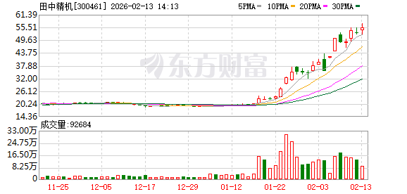 公司股价与市场表现 - 田中精机股价于2月13日上涨5.33%,报收55.51元/股,股价再创新高 [2] - 公司总市值突破87.18亿元 [2] - 当日成交额达到3.57亿元 [2]