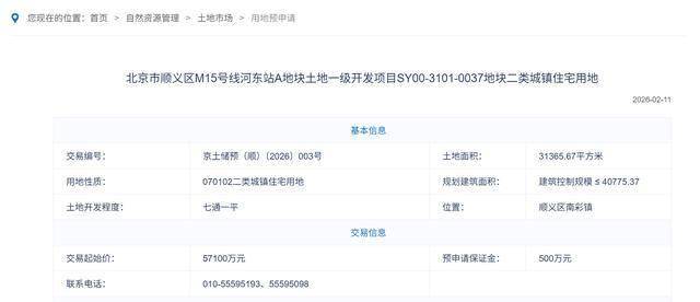 地块基本信息 - 地块为二类城镇住宅用地,总用地面积31365.67平方米,地上建筑规模40775.37平方米,容积率1.3,绿地率30%,建筑密度30%,建筑限高36米 [2] - 地块交易起始价为57100万元,起拍楼面价为1.4万元/平方米 [1] 地块出让安排 - 地块进入用地预申请阶段,受理时间自2026年2月11日起至2026年3月12日下午17:00 [1] 地块区位与配套 - 地块距离地铁15号线俸伯站直线距离约400米,交通便捷 [2] - 地块周边生活配套设施包括京汉生活广场、北京儿童医院顺义妇儿医院、潮白河森林公园、减河公园等 [2]