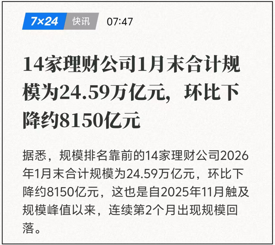 银行理财行业规模剧变 - 2026年1月,14家头部银行理财子公司规模合计下降超过8000亿元,这些公司占行业总规模约75% [1] - 以此线性外推,全行业1月单月规模下降约1万亿元,而2024年1月仅下降1200多亿元,2025年1月则增加约500亿元 [3] - 此次规模下降并非季节性因素,因为客户并无春节前赎回理财变现的需求,表明背后存在结构性变化 [3] 行业商业模式与竞争格局变化 - 理财子公司此前依赖的“留存收益”已基本释放完毕,“理财打榜”的商业模式面临巨大挑战 [3] - 行业竞争格局将发生“天翻地覆的变化”,未来将进入比拼投研内功、顶层产品线布局和渠道服务能力的新阶段 [3] - 规模的流失是对过去几年行业“水分”的挤出,是行业生态的健康变化,过去两年规模增长依赖“留存收益”和“打榜模式”变相抬高收益率 [4] 无风险利率与资产定价影响 - 过去20年,银行理财的业绩基准是中国居民实际的无风险利率,这个市场规模超过30万亿元 [3] - “留存收益”和“理财打榜”模式落幕,意味着纯债理财收益率将实质性下台阶,导致中国居民实际无风险利率下移 [5] - 无风险利率的下移将提高包括优质股权资产在内的所有风险资产的估值中枢 [5] 理财产品结构转型趋势 - 行业正加速从纯债理财向“固收+理财”和“多资产理财”转型,这些产品的推广力度和资金吸引力正在加大 [5] - “固收+理财”和“多资产理财”的上量,促使理财子公司加大了对“固收+”公募基金的配置力度 [5] - 纯债理财预期收益率下降,使得分红险、“固收+”基金在散户端的销售路径更加顺畅,年初以来“泛固收+”产品上量速度预计惊人 [5] 对产业链及市场的影响 - 理财转型涉及从管理人到销售渠道的整体转型,不同银行分行在过去几年对多资产布局的投教投入差异,将直接体现在其AUM变化上 [5] - “泛固收+”产品的快速上量,导致可转债等资产的估值持续处于高位 [5] - 低利率时代即是多资产时代,投资顾问必须具备资产配置能力,个人投资者要追求超额回报也必须加大对多元资产的配置 [5] 当前市场状况 - 临近春节,A股市场热度消退,成交量呈逐日缩量态势,预计可能跌破2万亿元 [7] - 杠杆资金参与力度变小,融资盘在近期净卖出,例如某日净卖出约40亿元,公募资金也因假期因素活跃度下降 [9] - 港股市场表现相对较好,恒生科技指数某日上涨0.9%,其中小米集团上涨超过4% [18] 特定板块与事件 - A股市场热点集中在商业航天板块,特别是火箭回收的“网捕”技术,相关上市公司股价在两个月内暴涨超过200% [13] - 投资需注意价格因素,避免追高,例如某公司股价从底部反弹50%,但此前经历了腰斩 [18] - 随着美元走弱,黄金和MSCI新兴市场指数持续走强,MSCI新兴市场指数创下历史新高 [21]