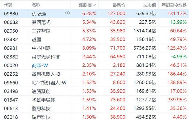 | 代码 | 名称 | | 涨跌幅 √ | 最新价 | 总市值 | 年初至今涨跌 | | --- | --- | --- | --- | --- | --- | --- | | 09880 | 优必选 | (0) | 6.28% | 127.000 | 639.32 Z | 131.12% | | 06682 | 第四范式 | | 5.34% | 43.820 | 227.5 Z | -13.99% | | 02050 | 三花智控 | | 5.33% | 35.980 | 1514.04亿 | 60.64% | | 02432 | 越讀 | | 4.72% | 35.500 | 156.18 Z | 49.79% | | 00981 | 中芯国际 | | 3.09% | 71.700 | 5736.29 Z | 125.47% | | 02382 | 舜宇光学科技 | | 2.44% | 64.950 | 711.08亿 | -4.93% | | 00020 | 商汤-W | | 2.35% | 2.180 | 881.24亿 | 46.31% | | 02252 | 微创机器人-B | | 2.10% | ...