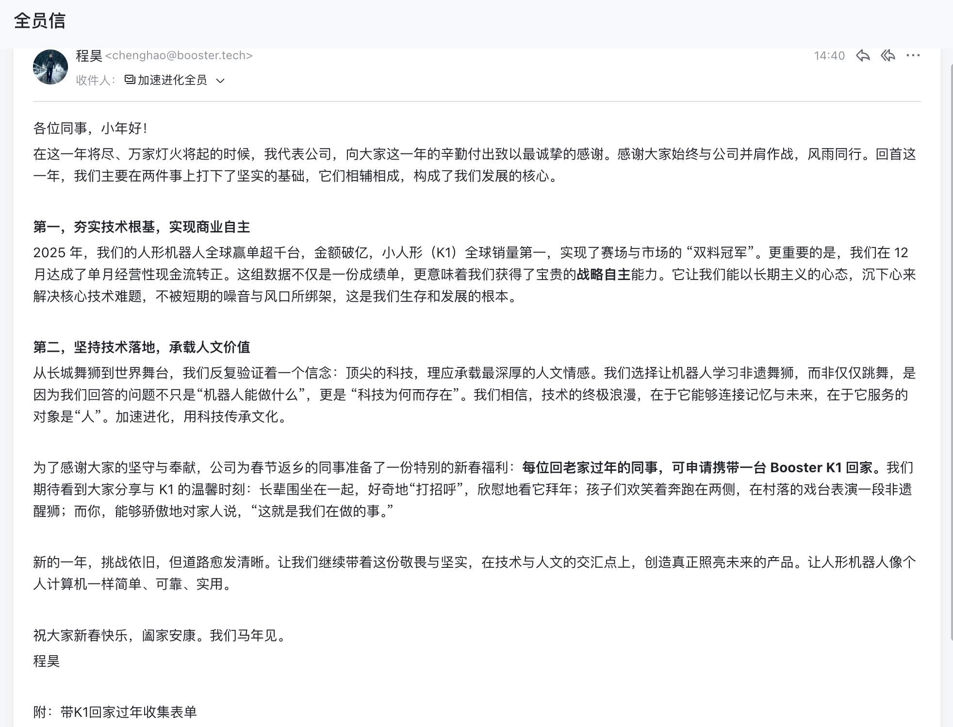 公司2025年经营业绩与里程碑 - 2025年人形机器人全球签单超千台 签约金额破亿人民币[1][4] - Booster K1小型人形机器人斩获全球销量第一 成为赛场与市场双料冠军[1][4] - 2025年12月实现单月经营性现金流转正 标志着公司迈入商业自主新阶段[1][4] 公司技术发展与商业战略 - 公司发展核心在于夯实技术根基与实现商业自主 坚持解决核心技术难题而不被短期风口绑架[1] - 公司坚持技术落地并承载人文价值 探索技术与人的价值连接[2][4] - 新一年公司战略是坚守技术与人文交汇点 致力于打造像个人计算机一样简单、可靠、实用的人形机器人[2][5] 公司品牌与文化践行 - 公司以机器人演绎非遗醒狮等文化项目 从长城走向全球舞台 践行科技传承文化的理念[2][4] - 为回馈员工并展示成果 公司推出春节福利 返乡员工可申请携带Booster K1机器人回家与家人互动[2][4]