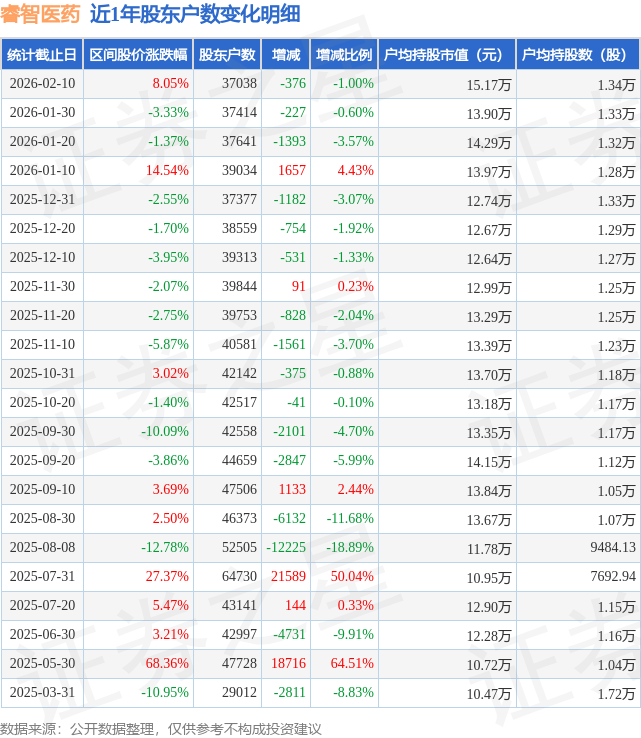 睿智医药(300149)2月10日股东户数3.7万户,较上期减少1%