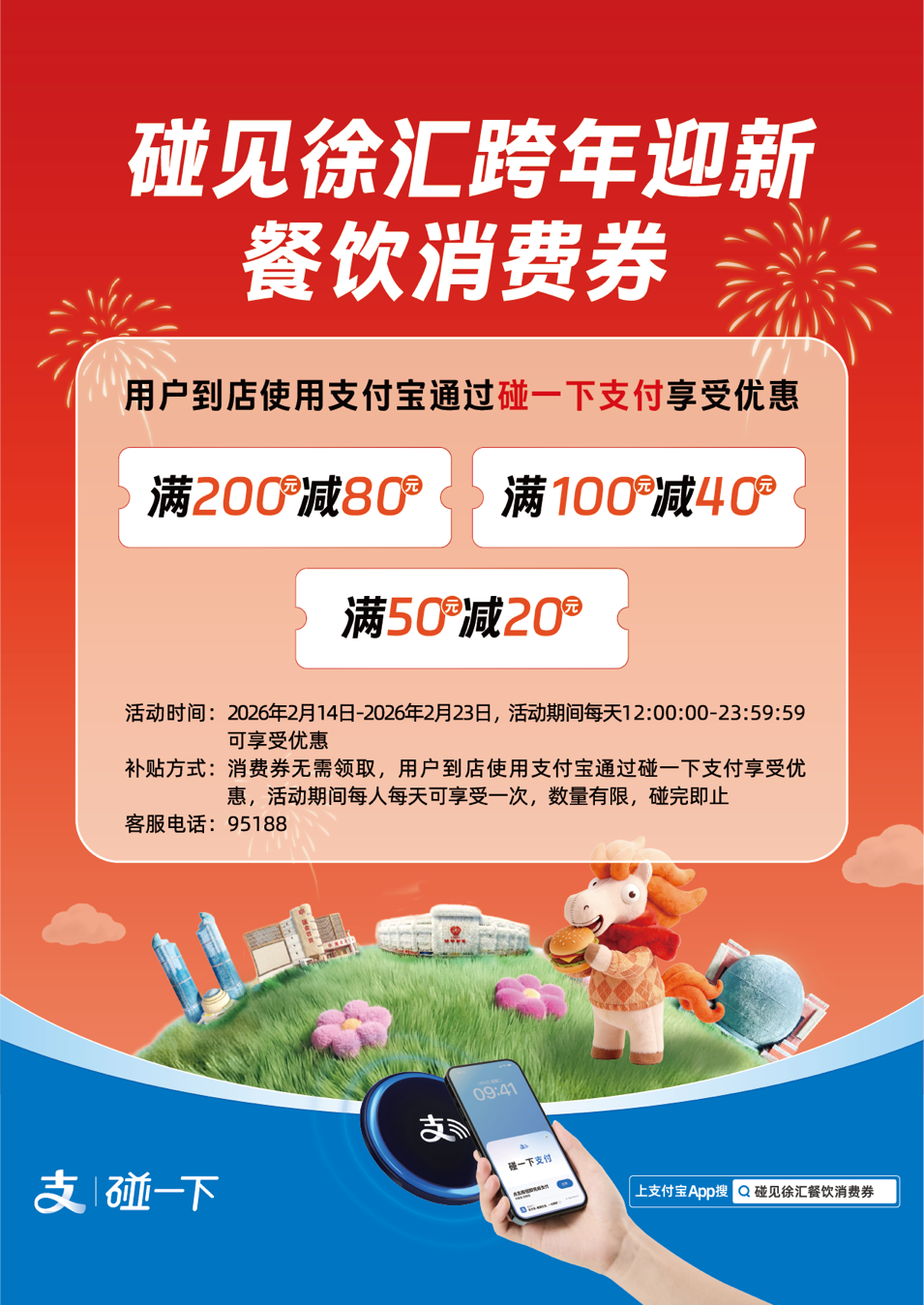 活动概述 - 徐汇区于2026年2月14日至2月23日启动“碰见徐汇”跨年迎新餐饮消费券活动 活动采用支付宝“碰一下”支付模式 提供阶梯立减优惠[2][3] - 活动核心模式为线下“即碰即用” 消费者无需提前领券或抢券 在指定商户消费时通过手机轻触感应设备即可自动享受优惠 简化参与流程[3][4] 活动细则 - 优惠具体为三档:满50元减20元 满100元减40元 满200元减80元[2][3] - 活动时间为每日12:00至23:59 每人每天限享1次优惠 数量有限先到先得[2][4] - 活动仅限徐汇区参与活动的线下门店堂食消费 不适用于代金券或预付充值等场景[4] 覆盖范围与商户参与 - 活动覆盖徐汇区超过50家餐饮商户 涵盖徐家汇商圈 衡复风貌区 徐汇滨江及社区商业体等多种餐饮类型[4] - 参与商户包括“爷爷不泡茶”和“云海肴”等 有商户反馈活动启动后午市客流明显提升[3][4] 活动效果与行业意义 - 活动旨在紧扣春节消费旺季 通过数字化手段将财政补贴高效转化为真实消费 激发商圈人气与消费热度[4] - 该模式被描述为精准惠民 旨在提升消费体验与城市温度 助力区域商业活力[4][5] - 具体案例显示 消费者购买105元茶饮后立减40元 实付65元 体现了活动的即时优惠效果[3]