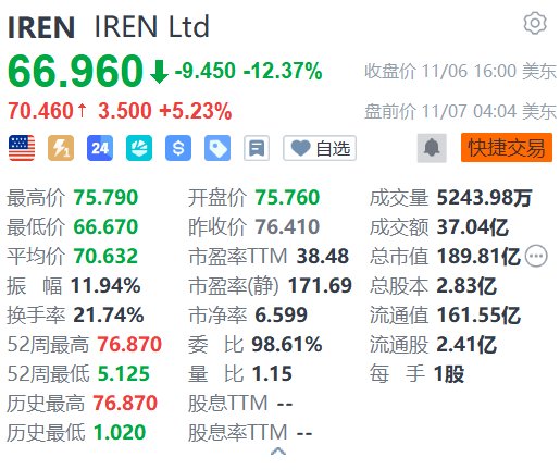| IREN IREN Ltd | | 03 | | --- | --- | --- | | 66.960 4 -9.450 -12.37% | | 收盘价 11/06 16:00 美东 | | 70.460 + 3.500 +5.23% | | 盘前价 11/07 04:04 美东 | | 一 7 24 4 5 8 0 | ● 快捷交易 | | | 最高价 75.790 | 开盘价 75.760 成交量 5243.98万 | | | 最低价 66.670 | 昨收价 76.410 成交额 37.04亿 | | | 平均价 70.632 | 市盈率TTM 38.48 总市值 189.81亿 (m) | | | 振 幅 11.94% | 市盈率(静) 171.69 总股本 2.83亿 | | | 换手率 21.74% | 市净率 6.599 流通值 161.55亿 | | | 52周最高 76.870 | 委 比 98.61% | 流通股 2.41亿 | | 52周最低 5.125 量 比 1.15 | | 每 手 1股 | | 历史最高 76.870 股息TTM -- | | | | 历史景低 1.020 | ...