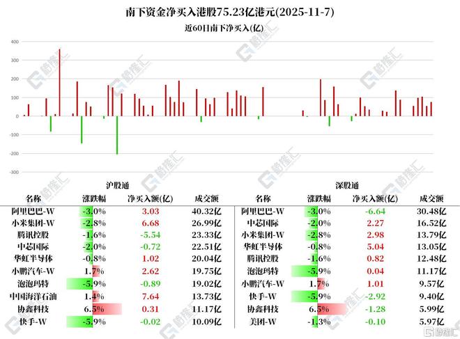 南下资金流向 - 11月7日南下资金净买入港股75.23亿港元 [1] - 重点净买入个股包括小米集团-W 9.66亿港元 中国海洋石油7.63亿港元 华虹半导体6.05亿港元 小鹏汽车-W 3.63亿港元 中芯国际1.55亿港元 [1] - 重点净卖出个股包括腾讯控股4.72亿港元 阿里巴巴-W 3.61亿港元 快手-W 2.94亿港元 [1] - 南下资金已连续8日净买入小米集团-W 累计金额达51.9497亿港元 [1] 小米集团-W - 公司高管在德国对小米SU7进行近800公里道路测试 最高时速达260km/h [3] - 公司计划于2027年正式进入欧洲电动汽车市场 [4] - 公司预计2026年下半年开始实现盈利 [4] 华虹半导体 - 里昂报告指出公司第三季毛利率及第四季指引均好于预期 受需求复苏及产品组合升级带动平均售价上升影响 [4] - 公司新12吋晶圆厂产能增长进度符合预期 收购华虹Fab5工厂项目按计划推进 [4] - 里昂预期公司将受益于半导体行业复苏 产品升级 产能扩张和收购将增强公司能力 [4] - 里昂上调公司H股目标价由68.4港元至95.6港元 A股目标价由95.1元至160.3元 维持跑赢大市评级 [4] 小鹏汽车-W - 公司发布全新一代增程技术解决方案鲲鹏超级增程 [4] - 首发车型小鹏X9超级增程开启预售 推出Max和Ultra两个版本 预售价分别为35万元和37万元 [4]
