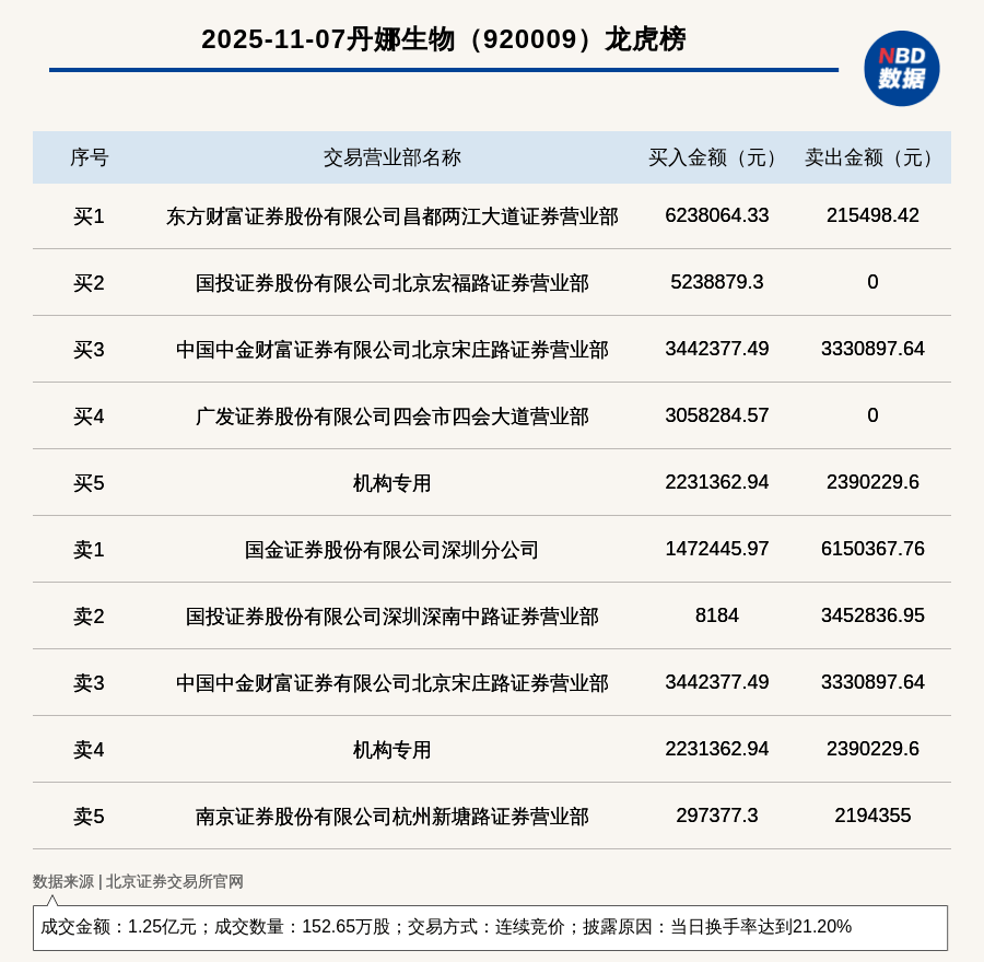 (记者 曾健辉) 免责声明:本文内容与数据仅供参考,不构成投资建议,使用前核实。据此操作,风险自担。 每日经济新闻 每经讯,2025年11月7日,北交所上市公司丹娜生物(920009,收盘价:81.7元)登上龙虎榜,交易方式是连续竞价,披露原因 是当日换手率达到21.20%,成交数量152.65万股,成交金额1.25亿元。买一席位为东方财富证券股份有限公司昌都两江大道证券 营业部,买入623.81万元;卖一席位为国金证券股份有限公司深圳分公司,卖出615.04万元。 | | 2025-11-07丹娜生物 (920009) 龙虎榜 | | | | --- | --- | --- | --- | | 序号 | 交易营业部名称 | 买入金额(元) | 卖出金额(元) | | नेट ग | 东方财富证券股份有限公司昌都两江大道证券营业部 | 6238064.33 | 215498.42 | | 买2 | 国投证券股份有限公司北京宏福路证券营业部 | 5238879.3 | 0 | | 买3 | 中国中金财富证券有限公司北京宋庄路证券营业部 | 3442377.49 | 3330897.64 | | ग्रेन प ...