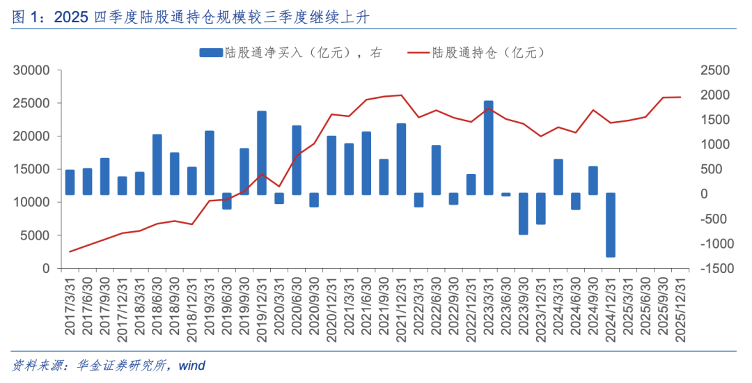 文章核心观点 - 华金证券研报指出,2025年第四季度陆股通持仓总规模环比小幅上升,资金在周期板块的持仓占比增加,并预计2026年一季度外资可能继续加仓核心资产、科技和周期行业 [1][19] 陆股通资金四季度持仓概况 - 2025年四季度陆股通持仓总规模接近2.59万亿元,较上季度环比增加54.06亿元 [1] - 板块方面,主板持仓占比较2025Q3小幅上升1.04个百分点,创业板下降0.65个百分点,科创板下降0.39个百分点 [1] - 风格方面,周期、成长、稳定风格持仓占比环比分别上升2.37、0.08、0.05个百分点,消费、金融风格分别下降2.37、0.15个百分点 [1] 行业持仓规模与变动 - 持仓规模最大的三个行业是:电力设备及新能源(17.78%)、电子(13.91%)、有色金属(7.18%)[1][8] - 持仓规模上升较多的行业:有色金属(占比7.18%,+1.96个百分点)、通信(3.48%,+0.77个百分点)、基础化工(3.69%,+0.48个百分点)[1][8] - 持仓规模下降较多的行业:医药(5.71%,-1.59个百分点)、食品饮料(5.43%,-0.91个百分点)、汽车(4.75%,-0.57个百分点)[1][8] - 估算四季度外资净流入较多的行业:有色金属(+248.72亿元)、通信(+112.78亿元)、基础化工(+57.11亿元)[8] - 估算四季度外资净流出较多的行业:医药(-256.65亿元)、食品饮料(-161.45亿元)、非银行金融(-80.01亿元)[8] 行业超配比情况 - 超配比最高的行业:电力设备及新能源(11.34%)、电子(2.80%)、有色金属(2.56%)[10] - 超配比最低的行业:银行(-3.93%)、石油石化(-2.37%)、计算机(-2.26%)[10] - 超配比环比上升较多的行业:有色金属(+1.40个百分点)、通信(+0.47个百分点)、基础化工(+0.29个百分点)[10] - 超配比环比下降较多的行业:医药(-0.90个百分点)、食品饮料(-0.58个百分点)、银行(-0.48个百分点)[10] 个股持仓变动与集中度 - 截至2025年12月31日,陆股通持仓规模最大的三只个股:宁德时代(2543.43亿元)、美的集团(770.49亿元)、贵州茅台(758.12亿元)[14] - 四季度持仓市值增加最多的个股:中际旭创(+137.98亿元,通信)、中国平安(+99.35亿元,非银金融)、思源电气(+85.55亿元,电新)[15] - 四季度持仓市值减少最多的个股:贵州茅台(-123.30亿元,食品饮料)、宁德时代(-113.16亿元,电新)、迈瑞医疗(-101.26亿元,医药)[15] - 估算四季度外资净流入最多的五只个股:宁德时代(+88.13亿元,电新)、立讯精密(+57.37亿元,电子)、潍柴动力(+51.24亿元,汽车)、招商银行(+46.64亿元,银行)、北方华创(+39.02亿元,电子)[15] - 估算四季度外资净流出最多的个股:贵州茅台(-86.96亿元,食品饮料)、药明康德(-62.09亿元,医药)、迈瑞医疗(-44.53亿元,医药)[15] - 四季度陆股通持股集中度:TOP5为18.96%(环比-0.71个百分点),TOP10为24.67%(-0.78个百分点),TOP30为35.86%(-1.84个百分点),TOP100为50.74%(-1.26个百分点)[15] 2026年一季度外资流向展望 - 预计陆股通资金后续可能持续流入,原因包括美联储可能再度降息促使外资加速流入A股,以及A股盈利处于回升周期且“十五五”规划政策有望推动基本面预期修复 [19] - 预计一季度外资可能重点流入核心资产、科技和周期行业,历史经验显示美联储降息周期下科技成长和部分周期行业可能占优,且春季行情中科技与周期作为双主线可能吸引外资 [20] - 从年报预告盈利增速看,科技成长中的汽车、军工、机械、通信、医药,以及周期中的有色金属、基础化工增速较高,业绩改善可能吸引外资流入 [20] - 四季度医药、食品饮料等核心资产超配比环比下降,且计算机、军工等成长行业超配比较低,一季度可能有所修正 [20] - 核心资产、科技和周期板块近期催化较多:医药行业年报预告业绩高增且有政策支持;科技创新政策可能落地,涉及6G、量子科技、AI等领域;有色金属和化工年报预告业绩增速较高 [21]