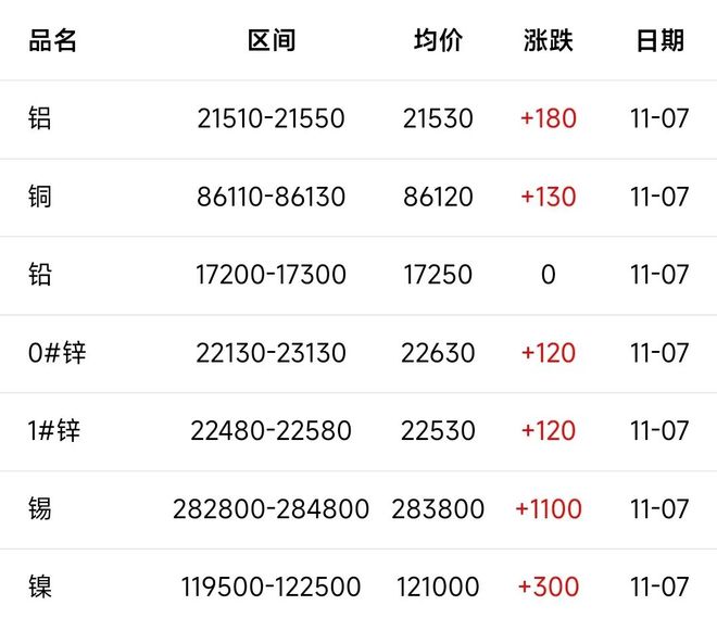 7日有色宝长江A00铝21510~21550均价21530涨180,前三日均价21367,前五日均价21362 来源:世铝网 | 品名 | 区间 | 均价 | 涨跌 | 日期 | | --- | --- | --- | --- | --- | | 铝 | 21510-21550 | 21530 | +180 | 11-07 | | 铜 | 86110-86130 | 86120 | +130 | 11-07 | | 铝 | 17200-17300 | 17250 | 0 | 11-07 | | 0#锌 | 22130-23130 | 22630 | +120 | 11-07 | | 1#锌 | 22480-22580 | 22530 | +120 | 11-07 | | 锡 | 282800-284800 283800 +1100 | | | 11-07 | | 렇 | 119500-122500 121000 | | +300 | 11-07 | ...