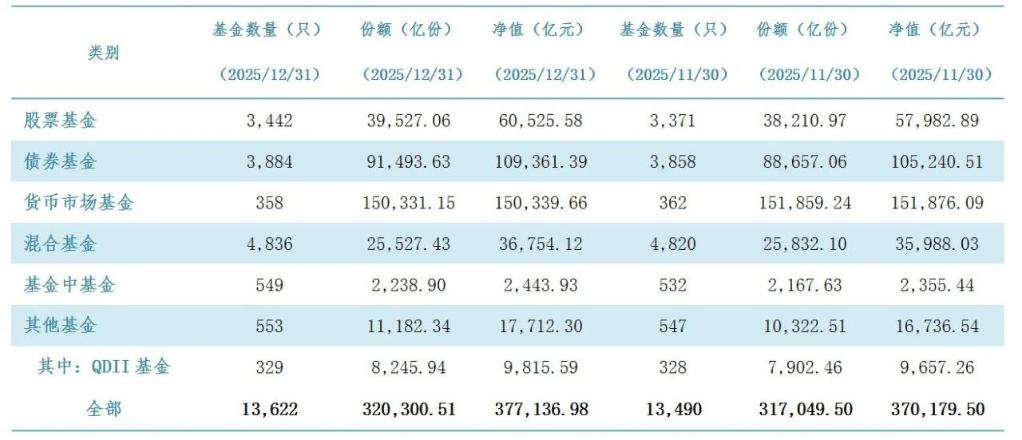 行业整体规模 - 截至2025年12月底,中国境内公募基金资产净值合计37.71万亿元 [1] - 全行业基金总数量为13,622只,总份额为320,300.51亿份,总净值为377,136.98亿元 [2] - 与2025年11月底相比,行业总资产净值增长约1.88%,从370,179.50亿元增至377,136.98亿元 [2] 各基金类别表现 - **股票基金**: 2025年12月底资产净值60,525.58亿元,较11月底的57,982.89亿元增长4.38% [2] - **债券基金**: 资产净值为109,361.39亿元,较11月底的105,240.51亿元增长3.91% [2] - **货币市场基金**: 资产净值为150,339.66亿元,较11月底的151,876.09亿元下降1.01% [2] - **混合基金**: 资产净值为36,754.12亿元,较11月底的35,988.03亿元增长2.13% [2] - **基金中基金(FOF)**: 资产净值为2,443.93亿元,较11月底的2,355.44亿元增长3.75% [2] - **其他基金**: 资产净值为17,712.30亿元,较11月底的16,736.54亿元增长5.83% [2] - **QDII基金**: 作为其他基金的子类,资产净值为9,815.59亿元,较11月底的9,657.26亿元增长1.64% [2] 行业结构与参与者 - 截至2025年12月底,中国境内公募基金管理机构共计165家 [3] - 管理机构中包括150家基金管理公司以及15家取得公募基金管理资格的资产管理机构 [3]