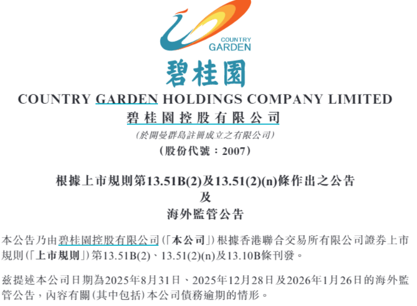 公司收到自律监管措施 - 碧桂园公司及有关责任人于2月10日晚间收到交易所自律监管措施决定 [1] - 公司及执行董事杨惠妍、莫斌、财务负责人伍碧君收到上交所《纪律处分决定书》 [3] - 上交所对公司及相关人员予以通报批评并记入诚信档案 [3] 违规事实与原因 - 公司未能及时披露2023年8月至12月、2024年1月至6月、2024年7月至12月期间存在的债务逾期情形 [3] - 违规原因是公司因客观原因未能及时披露,并非相关人士怠于履职尽责 [3] - 董事会(涉事三人除外)认为无理由对三人的诚信及能力存疑,三人继续担任执行董事是合适的 [3] 公司回应与后续措施 - 公司及相关人士高度重视上述事项,将以此为鉴 [3] - 公司将严格遵循债券信息披露要求,依法履行信息披露义务 [3] - 公司将切实维护债券持有人的合法权益 [3]