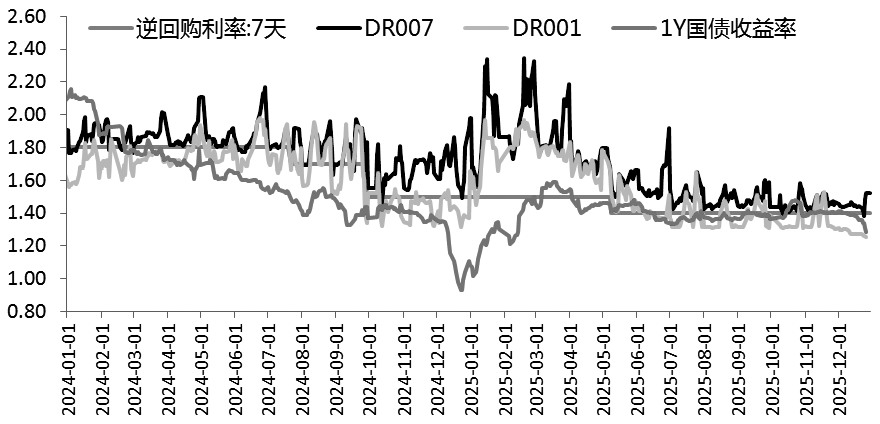 由于增量政策加力不及预期,在资金面宽松及年初配置预期支撑下,债市情绪好转,整体出现修复行情,交易者对年底年初 资金面宽松的预期为短期多头提供了博弈机会。不过在交易盘主导的情况下,债市波动明显放大。当前债市缺乏明确方向, 市场走势受市场情绪与预期的影响较大。尤其是年底机构止盈压力较大,超长端债市多呈现"慢涨快跌"格局,波动风险仍然 较大。 图为资金利率保持低位(单位:%) 从基本面角度看,经过前期调整后,在经济持续磨底的基本面格局以及流动性持续偏宽松的支撑下,长端国债收益率上行空 间不足,配置价值有所回升,成为本轮债市修复行情的主要驱动。短期10年期国债收益率的关键位置仍是1.85%,整体向上 的空间不足。 从政策角度看,2026年大概率延续"财政扩张+货币配合"的政策框架。财政政策延续积极发力态势,在赤字率的必要扩张下, 财政政策更加强调实际支出的总量和结构。"十五五"规划建议提出"增加政府资金用于民生保障支出",财政加力"投资于 人"或成为支撑狭义财政扩张的主要驱动。预计狭义赤字率大概率小幅抬升至4.2%,并继续提高新增专项债、特别国债发行 限额,支撑广义财政积极扩张。 货币政策方面,降准降息仍然是政策工具 ...