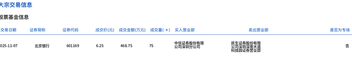 | 交易日期 | | 证券代码 | 成交价(元) 成交金额(万元) 成交量( *) 买入营业部 | | | | 卖出营业部 | 是否为专场 | | --- | --- | --- | --- | --- | --- | --- | --- | --- | | 025-11-07 | 北京报行 | 601169 | 6.25 468.75 | 75 | 去筒플랫劈熨鸟圆 | 零售量和壁留契服 | | 190 | 11月7日,北京银行大宗交易成交75万股,成交额468.75万元,占当日总成交额的0.47%,成交价6.25 元,较市场收盘价5.67元溢价10.23%。 ...