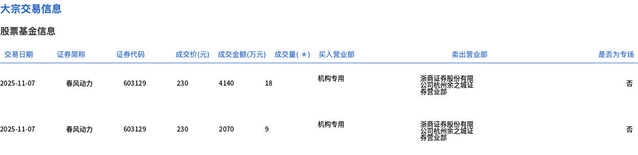 11月7日,春风动力大宗交易成交27万股,成交额6210万元,占当日总成交额的23.04%,成交价230元,较市场收盘价245.81元折价6.43%。 | 交易日期 | 证券简称 | 证券代码 | 成交价(元) | 成交金额(万元) | 成交量(*) 买入营业部 | | | 卖出营业部 | | --- | --- | --- | --- | --- | --- | --- | --- | --- | | 2025-11-07 | 春风动力 | 603129 | 230 | 4140 | 18 | 机构专用 | 新聞正義投分直播 公園並納美之遊遊 | | | 2025-11-07 | 春风动力 | 603129 | 230 | 9 2070 | | 机构专用 | 新疆亚荣股份有限 发自述州美之城证 | | ...