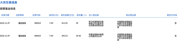 | 交易日期 | 证券简称 | 证券代码 | | | 成交价(元) 成交金额(万元) 成交量(*) 买入营业部 | | 类出营业部 | 是否为专场 | | | --- | --- | --- | --- | --- | --- | --- | --- | --- | --- | | 2025-11-07 | 耀皮玻璃 | 618000 | 7.49 | 411.95 | રેર | 모두 그 기 | 靚離 | | Ka | | 2025-11-07 | 雕皮玻璃 | 600819 | 7.49 | 295.53 | 39.46 | 去奇攝索劈毀奇眼 | 想要能 | | Ka | 11月7日,耀皮玻璃大宗交易成交94.46万股,成交额707.48万元,占当日总成交额的2.8%,成交价7.49 元,较市场收盘价8.51元折价11.99%。 ...