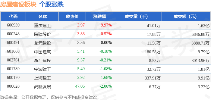 证券之星消息,11月7日房屋建设板块较上一交易日下跌0.12%,高新发展领跌。当日上证指数报收于 3997.56,下跌0.25%。深证成指报收于13404.06,下跌0.36%。房屋建设板块个股涨跌见下表: | 代码 | 名称 | 收盘价 | 涨跌幅 | 成交量(手) | 成交额(元) | | --- | --- | --- | --- | --- | --- | | 600939 | 重庆建工 | 3.97 | 9.97% | 41.01万 | 1.63亿 | | 600248 | 陕建股份 | 3.83 | 0.52% | 17.88万 | 6846.88万 | | 600491 | 龙元建设 | 3.36 | 0.00% | 11.56万 | 3880.71万 | | 601668 | 中国建筑 | 5.41 | -0.18% | 180.58万 | 9.79亿 | | 002761 | 浙江建投 | 9.37 | -0.21% | 8.53万 | 8013.96万 | | 601789 | 宁波建工 | 5.49 | -1.08% | 32.72万 | 1.81亿 | | 600170 | ┣海建工 ...