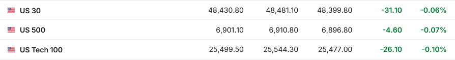 盘前市场动向 1. 12月30日(周二)美股盘前,美股三大股指期货齐跌。截至发稿,道指期货跌0.06%,标普500指数期货跌0.07%,纳指期货跌 0.10%。 | = ns 30 | 48,430.80 | 48,481.10 | 48,399.80 | -31.10 | -0.06% | | --- | --- | --- | --- | --- | --- | | = US 500 | 6,901.10 | 6,910.80 | 6,896.80 | -4.60 | -0.07% | | 트 US Tech 100 | 25,499.50 | 25,544.30 | 25,477.00 | -26.10 | -0.10% | 2. 截至发稿,德国DAX指数涨0.25%,英国富时100指数涨0.35%,法国CAC40指数涨0.29%,欧洲斯托克50指数涨0.46%。 | 德国DAX30 | 24,425.94 | 24,464.73 | 24,319.02 | +61.02 | +0.25% | | --- | --- | --- | --- | --- | --- | | 瑞 英国富时100 | 9,9 ...