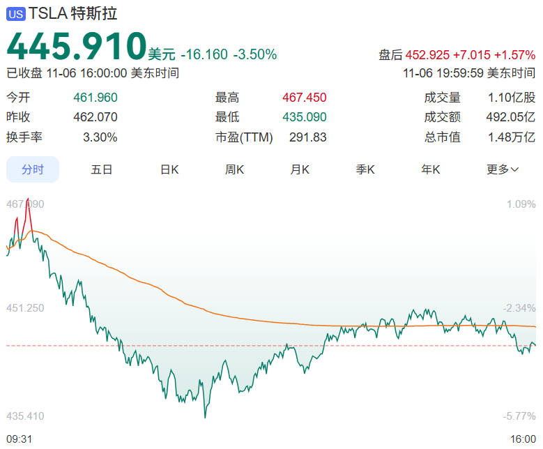 美东时间11月6日, 特斯拉召开年度股东大会,特斯拉股东批准马斯克的1万亿美元薪酬计划,超过75%的股东 批准,支持他将公司转变为人工智能和机器人巨头的愿景。 | 445.910美元 -16.160 -3.50% | | | | | 盘后 452.925 +7.015 +1.57% | | | | --- | --- | --- | --- | --- | --- | --- | --- | | 已收盘 11-06 16:00:00 美东时间 | | | | | 11-06 19:59:59 美东时间 | | | | 今开 | 461.960 | | 最高 | 467.450 | | 成交量 | 1.10亿股 | | 昨收 | 462.070 | | 最低 | 435.090 | | 成交额 | 492.05亿 | | 换手率 | 3.30% | | 市盈(TTM) | 291.83 | | 总市值 | 1.48万亿 | | 分时 | 五日 | 日K | 周K | 月K | 季K | 年K | 更多v | | 467 090 | | | | | | | 1.09% | 根据协议,特斯拉董事会向马斯克授予最多4 ...