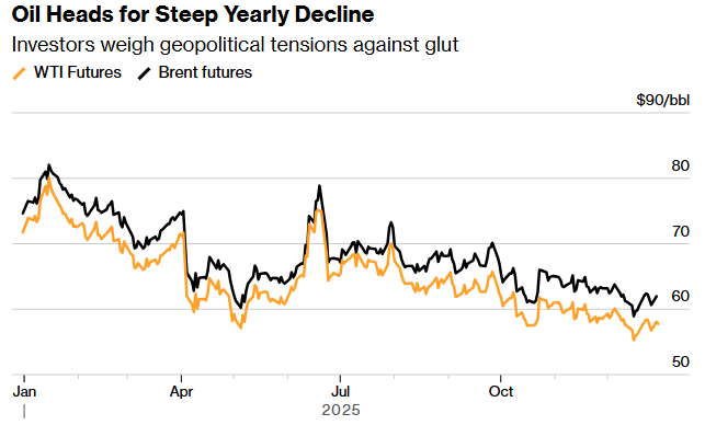 由于OPEC+为夺回市场份额而增产,全球原油产量或将超过需求,原油价格预计将大幅下跌。Vortexa Ltd.的数据显示,供应充足的迹象之一是,上周全球油轮上停泊至少7天的原油量激增15%,使原油总量 逼近去年11月创下的2020年以来的最高水平。 智通财经APP获悉,交易员们正在权衡从委内瑞拉到俄罗斯和伊朗的地缘政治紧张局势,油价因此保持 上涨。布伦特原油周一上涨2.1%后,稳定在每桶62美元附近,而WTI原油则高于每桶58美元。面对美国 的部分封锁,委内瑞拉已开始关闭其拥有全球最大油田地区的油井,该封锁限制了原油出口,导致当地 储油罐全满。另据报道,美国总统特朗普称,美国袭击了委内瑞拉境内的一处设施。 此前,俄罗斯总统普京表示,在其住所遭到无人机袭击后,他将调整谈判立场,这使得特朗普结束乌克 兰战争的努力面临新的阻碍。与此同时,特朗普誓言,如果伊朗重建核计划,美国将再次打击伊朗。 本周晚些时候将提供更多关于美国石油状况的信息,美国石油协会将于周二晚些时候发布库存变化预估 值。随后,周三将公布截至12月26日当周的官方数据。 Qisheng Futures分析师Gao Jian称:"地缘政治动荡在很大程度上 ...