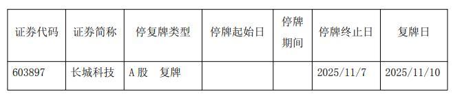11月7日盘后,长城科技(603897)发布公告称,停牌期间,公司实控人就筹划控制权变更事项进行了充分探讨,但由于涉及事项较多,与交易对方就核 心事项未达成共识,经慎重考虑,交易双方决定终止筹划本次重大事项。 | 证券代码 | 证券简称 | 停复牌类型 | 停牌起始日 | 停牌 期间 | 停牌终止日 | 复牌日 | | --- | --- | --- | --- | --- | --- | --- | | 603897 | 长城科技 | A 股 复牌 | | | 2025/11/7 | 2025/11/10 | 经公司向上海证券交易所申请,公司股票将于2025年11月10日(星期一)上午开市起复牌。 此前,公司实际控制人顾林祥、沈宝珠筹划公司股份协议转让事宜,该事项可能导致公司控制权发生变更。鉴于上述事项尚存在重大不确定性,公司股票 已于2025年11月3日(星期一)开市起停牌。 资料显示,浙江长城电工(600192)科技股份有限公司于2018年4月10日上市,公司的主营业务是电磁线的研发、生产和销售。公司的主要产品是电磁 线。 2025年前三季度,公司营业收入为94.4亿元,同比下降0.7%;归母净利润为2 ...