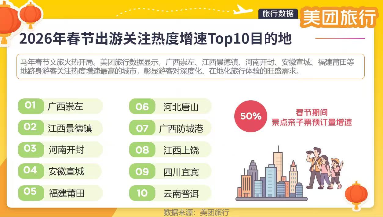 出行预订趋势 - 大年初二至初五期间,机票预订量同比增长40% [1] - 春节期间,酒店、民宿多间预订增幅达32%,景点亲子票预订量同比增长50% [7] - 潮汕野生动物园春节前及春节假期预订量整体同比增长50% [7] 热门目的地与景区 - 热门出行目的地包括北京、成都、广州、重庆、上海、深圳、郑州、西安、杭州、武汉 [1] - 春节期间最受欢迎的景区包括自贡·中华彩灯大世界、洛邑古城、西安博物院、西安城墙·碑林历史文化景区、拙政园、老君山风景名胜区、黄山风景区、龙门石窟、滕王阁、秦始皇帝陵博物院(兵马俑) [7] - 游客关注热度增速最高的城市包括广西崇左、江西景德镇、河南开封、安徽宣城、福建莆田、河北唐山、广西防城港、江西上饶、四川宜宾、云南普洱 [3] “反向过年”与短途出行 - 今年反向过年趋势显著,打破了春运“单向潮汐”的传统格局 [4] - 北京客源主要流向西安、南京、洛阳、开封、天津等地,上海客源更青睐南京、杭州、苏州、西安、湖州等周边及邻近热门城市 [4] - “4小时高铁圈”的短途出行热度较高 [4] 餐饮消费趋势 - 假期前四天,大众点评“必吃榜”整体流量较去年春节上涨接近40% [5] - “必吃榜”异地流量涨幅接近50%,上榜商户订单量较去年春节增长81% [5] - 受“反向过年”趋势推动,上海、北京、广州、深圳、成都位列“必吃榜”总体流量前五 [5] 地方美食城市崛起 - 假期前四天,汕头、顺德、泉州、珠海、三亚为大众点评“必吃榜”总体流量Top5宝藏美食城市 [6] - 开封、泰安、大同、连云港、延安为“必吃榜”流量增幅最高的宝藏城市,较去年春节增幅均在200%左右 [6] 旅游市场特征 - 非遗年味成为吸引远方游客的关键,家庭游、亲子游、年轻群体和银发游客都明显增多 [7] - 游客对深度化、在地化旅行体验的需求旺盛 [3]