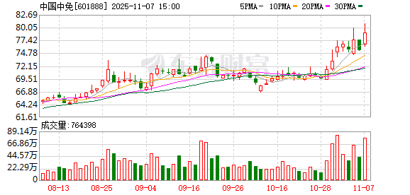 机构评级来看,近5日共有5家机构给予该股评级,预计目标价最高的是华创证券,11月5日华创证券发 布的研报预计公司目标价为84.54元。 据天眼查APP显示,中国旅游集团中免股份有限公司成立于2008年03月28日,注册资本206885.9044万 人民币。(数据宝) 中国中免11月7日大宗交易平台出现一笔成交,成交量30.00万股,成交金额2369.70万元,大宗交易成交 价为78.99元。该笔交易的买方营业部为国泰海通证券股份有限公司总部,卖方营业部为招商证券股份 有限公司上海陆家嘴东路证券营业部。 证券时报·数据宝统计显示,中国中免今日收盘价为78.99元,上涨4.84%,日换手率为3.92%,成交额为 60.29亿元,全天主力资金净流入3.28亿元,近5日该股累计上涨3.84%,近5日资金合计净流出8809.62万 元。 两融数据显示,该股最新融资余额为51.21亿元,近5日增加2.16亿元,增幅为4.41%。 11月7日中国中免大宗交易一览 | 成交量 | 成交金额 | 成交价 | 相对当日收盘折 | | | | --- | --- | --- | --- | --- | --- | | (万 | ( ...
