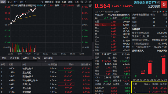 10月31日早盘,港股延续调整,恒指、恒科指均飘绿,创新药板块逆市爆发!100%创新药研发标的 ——港股通创新药ETF(520880)单边上行,强势突破5%!实时成交超4.6亿元,大幅超越上一日全天 成交额! 成份股方面,三生制药、映恩生物-B涨超12%,信达生物强劲反弹8%,荣昌生物、科伦博泰生物-B等 大幅跟涨。 值得关注的是,巨量资金提前埋伏。数据显示,截至10月30日,港股通创新药ETF(520880)近10日累 计吸金超2.6亿元。 【创新药"新势力"——港股通创新药ETF(520880):纯正创新药,聚焦真龙头,港股高弹性】 港股通创新药ETF(520880)被动跟踪恒生港股通创新药精选指数,该指数完全不含CXO,100%布局 创新药研发类公司,超7成仓位押注大市值创新药龙头,是精准表征创新药硬核力量的纯正创新药指 数。场外投资者可关注其联接基金:025221。 | | | 港股通创新药ETF (520880) 标的指数 | | | --- | --- | --- | --- | | | | 前十成份股权重高达71.63%,龙头优势显著 | | | 代码 | 简称 | 权重(%) | 总市值(亿港 ...