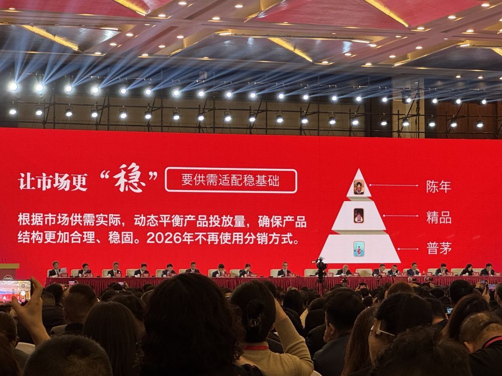 21记者了解到,为此茅台2026年将适度减少高附加值产品(即普茅之上的非标产品)投放量,更加精准地界定普茅、精品、陈年等产品面向的 不同客群和消费场景,靶向施策开展相关市场活动和品牌宣传,打造更加稳固的"金字塔"型产品体系。另外将根据市场供需实际,动态平衡产 品投放量,确保产品结构更加合理、稳固。(21世纪经济报道) 陈华透露,将"以消费者为中心、推进市场化转型"作为茅台酒2026年市场营销工作的首要任务,目的是通过一系列市场化改革措施,让消费者 能够公平、快捷、保真地买到茅台酒。总的原则和目标是以消费者为中心,坚持市场化、法治化、科学化,通过线上线下协同发力,推动茅台 酒实现市场投放精准科学,产品价格平稳有序,渠道生态持续向好,消费端触达能力显著增强,服务水平大幅提升,努力构建供需适配、量价 平衡的良好格局。 产品投放策略方面,会上明确,2026年将巩固茅台酒金字塔产品结构,继续维护好普茅市场主力竞争者的角色,精品茅台将成为普茅之上的又 一款大单品,陈年茅台关键在于维护好高端价值。 南方财经12月28日电,2026年贵州茅台酒全国经销商联谊会于28日下午举行。 21记者在现场了解到,茅台集团党委书记、董事长 ...