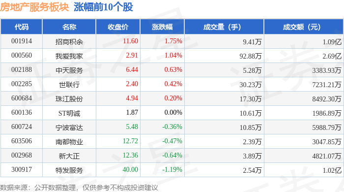 | 代码 | 名称 | 收盘价 | 涨跌幅 | 成交量(手) | 成交额(元) | | --- | --- | --- | --- | --- | --- | | 000056 | 皇庭国际 | 2.32 | -1.28% | 38.45万 | 8962.67万 | | 300917 | 特发服务 | 40.00 | -1.19% | 2.54万 | + 1.02亿 | | 002968 | 新大正 | 12.36 | -0.64% | 3.89万 | 4821.07万 | | 603506 | 南都物业 | 12.72 | -0.47% | 1 2.39万 | 3047.85万 | | 600724 | 宁波富达 | 5.48 | -0.36% | 10.85万 | 5988.79万 | | 600136 | ST明诚 | 1.87 | 0.00% | 10.61万 | 1986.89万 | | 600684 | 珠江股份 | 4.94 | 0.20% | 17.30万 | 8492.30万 | | 002285 | 世联行 | 2.40 | 0.42% | 30.23万 | 7231.21万 | | 00 ...