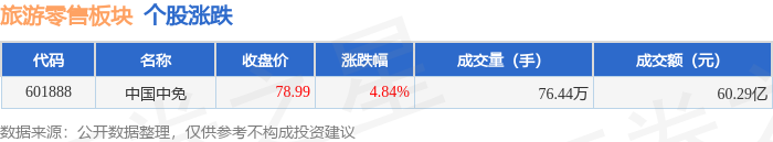 证券之星消息,11月7日旅游零售板块较上一交易日上涨4.84%,中国中免领涨。当日上证指数报收于 3997.56,下跌0.25%。深证成指报收于13404.06,下跌0.36%。旅游零售板块个股涨跌见下表: | 代码 | 名称 | 收盘价 | 涨跌幅 | | 成交量(手) | | 成交额(元) | | | --- | --- | --- | --- | --- | --- | --- | --- | --- | | 601888 | 中国中免 | 66'82 | | 4.84% | | 76.44万 | | 60.29 7 | | | | | 代码 名称 主力净流入 (元) 主力净占比 游资净流入 (元) 游资净占比 散户净占比 | | | | | --- | --- | --- | --- | --- | --- | --- | | 601888 中国中免 | 4.35亿 | 7.21% | -8112.27万 | -1.35% | -3.54亿 | -5.86% | 以上内容为证券之星据公开信息整理,由AI算法生成(网信算备310104345710301240019号),不构成投资建议。 从资金流向上来看 ...