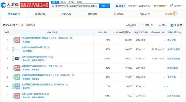 天眼查App显示,近日,四川省成都市产投电子信息重大产业化项目股权投资基金合伙企业(有限合 伙)成立,执行事务合伙人为成都先进资本管理有限公司,出资额100亿人民币,经营范围包括以私募 基金从事股权投资、投资管理、资产管理等活动。合伙人信息显示,该基金由四川省先进制造投资引导 基金合伙企业(有限合伙)、成都产业投资集团有限公司、成都先进制造产业投资有限公司等共同出 资。 | 大限量 | 重公司 型合设 都在用的商业重到工 | 图关照 看见比 | | | | | | --- | --- | --- | --- | --- | --- | --- | | | 国家中小企业发展了那全旗下机用 | 图川省成都市产投电子领导重大产业化项目贸公交通路 口 | 300-1 | 2 应用 · | 慶劳台作 | 企业版产品。 哲开昌会员 · 皇 感吸风 | | 基本信息 10 | 法律诉讼 | 经营内险。 | 径营信息 | 公司发展 | 知识产权 | 用中植製( | | 工营信息 历史工鸡祖剧 | | | | | | 0 85 | | 企业名称 | | 四川省成都市产投电子信息重大产业化项目股权投资基金台伙企业(有限合伙) | ...