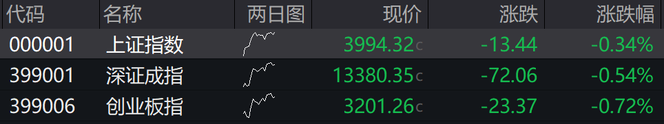 盘面上,算力硬件产业链调整,CPO、存储器方向领跌;电工电网概念股跌幅靠前。 09:33 创业板指下挫跌逾1%,沪指跌0.18%,深成指跌0.72%。半导体芯片、算力硬件、消费电子等方向跌幅居前,市场下跌个股近3000 只。 09:31 标榜股份复牌一字跌停,消息面上,公司公告,标榜股份控股股东及实际控制人因核心条款未达成一致,决定终止筹划控制权变更 事项。 09:27 海南自贸区板块高开,海马汽车涨停,海南发展、康芝药业、欣龙控股、凯撒旅业、海峡股份跟涨。 09:25 A股开盘丨三大指数集体低开 沪指低开0.34%,深成指低开0.54%,创业板指低开0.72%。 | 代码 | 名称 | 两日图 | 现价 | 涨跌 | 涨跌幅 | | --- | --- | --- | --- | --- | --- | | 000001 | 上证指数 | mr | 3994.32c | -13.44 | -0.34% | | 399001 | 深证成指 | 5 | 13380.35c | -72.06 | -0.54% | | 399006 | 创业板指 | 3 | 3201.26c | -23.37 | -0.72% | ...