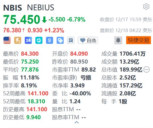 | NBIS NEBIUS | | | --- | --- | | 75.450 4 -5.500 -6.79% | 收盘价 12/17 15:59 美东 | | 76.380 + 0.930 +1.23% | 盘前价 12/18 04:22 美东 | | 一 72 24 4 8 8 8 8 | ● 快捷交易 | | 最高价 84.300 | 开盘价 84.090 成交量 1706.41万 | | 最低价 75.250 | 昨收价 80.950 成交额 13.29亿 | | 平均价 77.876 | 市盈率TM 89.82 总市值 189.99亿 (--) | | 振 幅 11.18% | 市盈率(静) 总股本 2.52亿 | | 换手率 8.19% | 市净率 3.949 流通值 157.29亿 | | 52周最高 141.100 委 比 -40.00% | 流通股 2.08亿 | | 52周最低 18.310 | 量 比 1.24 每 手 1股 | | 历史最高 141.100 股息TTM -- | | | 历史最低 9.940 | 股息率ITM -- | 荷兰人工智能基础设施供应商Nebius(NBIS ...