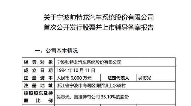 瑞财经 刘治颖 11月17日,宁波帅特龙汽车系统股份有限公司(以下简称:帅特龙)在宁波证监局完成 IPO辅导备案,辅导机构为国金证券股份有限公司。 吴锡辉、周伟力系吴志光、周小平之子,吴蕾蕾、吴一扬系吴志光、周小平之女。 目前,吴志光担任公司董事长, 吴志光,男,1953年3月出生,无境外居留权,中国国籍。高中学历,高级经济师,1993年10月至1994 年10月任鄞县星光汽车内饰厂厂长;1994年10月至2013年5月任宁波帅特龙车辆部件有限公司执行董事 兼总经理;2010年3月至今任长春蕾扬进出口贸易有限公司执行董事、总经理;2012年1月至今任上海蕾 扬进出口有限公司执行董事、总经理;2013年5月至2024年6月任宁波帅特龙集团有限公司董事长;2015 年2月至今任宁波蕾扬进出口有限公司执行董事、总经理,任宁波奥列德进出口有限公司董事长、总经 理;2024年6月至今任宁波帅特龙汽车系统股份有限公司董事长。 帅特龙创办于1994年,法定代表人为吴志光,注册资本为6000万元,是一家集设计、研发、制造、销售 汽车功能性内外饰件总成为一体的国家高新技术企业。公司已于2025年9月挂牌新三板。 2023年、2 ...