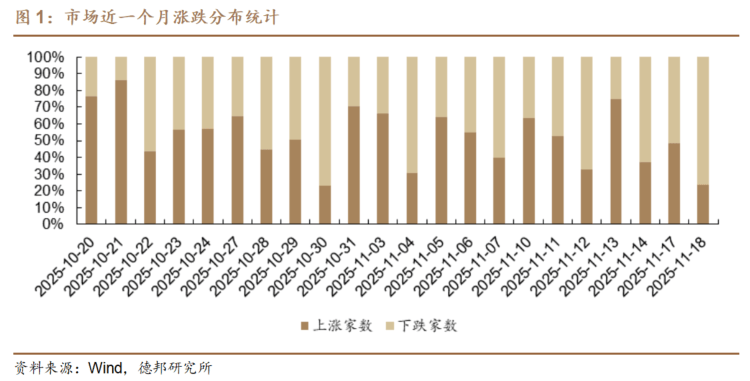 程强、翟堃、高嘉麒(程强系德邦证券研究所所长、首席经济学家、中国首席经济学家论坛理事) PART.01 市场概览 2025年11月18日周二,A股市场延续调整;国债期货偏强震荡;商品多数下跌,焦煤跌近4%。 PART.02 市场行情分析 预计债市短期震荡与长期宽松并存。央行三季度货币政策执行报告明确"实施好适度宽松的货币政策",国债买 卖操作常态化或为长端利率提供"安全垫";年末银行理财"冲规模"、保险资金"资产荒"背景下,利率债的配置 价值或将有所提升。我们认为当前债市核心逻辑仍为"政策托底+配置驱动",短期震荡与长期宽松并存,建议 重点关注美债收益率波动和A股市场强弱变化。 1) 股票市场:外部因素干扰,连续三日调整 连续三日震荡调整。今日A股市场延续调整,上证指数低开后震荡下行,盘中一度下跌超1%,最终下跌0.81% 收报3939.81点,连续三日下跌;深证成指、创业板指分别下跌0.92%、1.16%,科创50指数逆势上涨0.29%,北 证50指数重挫2.92%。全市场成交额1.95万亿,较前一日放量0.8%,合计4103只个股下跌,创近一个月以来最 多。 热门板块领跌,AI应用走强。今日领跌板块多为前 ...