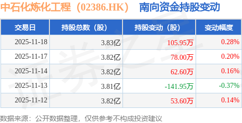 中石化炼化工程(02386.HK):11月18日南向资金增持105.95万股