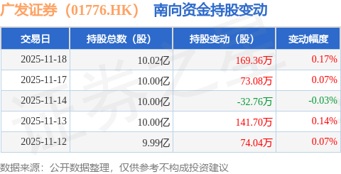证券之星消息,11月18日南向资金增持169.36万股广发证券(01776.HK)。近5个交易日中,获南向资 金增持的有4天,累计净增持425.42万股。近20个交易日中,获南向资金增持的有13天,累计净增持 1807.36万股。截至目前,南向资金持有广发证券(01776.HK)10.02亿股,占公司已发行普通股的 58.87%。 | 交易日 | 持股总数(股) | 持股变动(股) | 变动幅度 | | --- | --- | --- | --- | | 2025-11-18 | 10.02亿 | 169.36万 | 0.17% | | 2025-11-17 | 10.00亿 | 73.08万 | 0.07% | | 2025-11-14 | 10.00亿 | -32.76万 | -0.03% | | 2025-11-13 | 10.00亿 | 141.70万 | 0.14% | | 2025-11-12 | 2666.6 | 74.04万 | 0.07% | 广发证券股份有限公司是一家主要从事证券业务的中国公司。该公司通过五个分部开展业务。投资银行 分部从事股权融资、债务融资、财务顾问和企业解决方案等。财富 ...