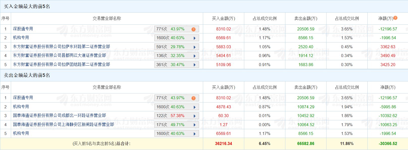 格隆汇11月24日|此前涨停的视觉中国(000681.SZ)今日涨0.87%,换手率32.12%,成交额56.14亿元。龙虎榜数据显示,深股通买入8310万元,卖出2.05亿 元,净卖出1.22亿元;游资"成都系"位列卖三席位,净卖出1.04亿元;两家机构买入1.14亿元,卖出1.94亿元,净卖出7992万元。上榜席位全天买入3.62亿 元,卖出6.66亿元,合计净卖出3.04亿元。(格隆汇) | 序号 | 交易营业部名称 | | | 买人金额(万) | 占总成交比例 | | --- | --- | --- | --- | --- | --- | | 1 | 深股通专用 | 771次 43.97% | 2 | 8310.02 | 1.48% | | 2 | 机构专用 | 1600次 40.63% | A | 6569.61 | 1.17% | | 3 | 东方财富证券股份有限公司拉萨东环路第二证券营业部 | 591次 29.78% | A | 5883.03 | 1.05% | | 4 | 东方财富证券股份有限公司昌都两江大道证券营业部 | 136次 32.35% | ▶ | 5404.61 | 0.96% ...