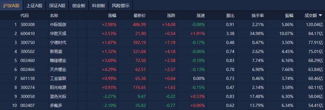 市场早间冲高回落,深成指、沪指先后翻绿,创业板指一度涨超1%。但黄白线分化明显,中小盘股普 跌,微盘股指数跌超2%。南财金融终端显示,截至早盘收盘,沪指跌0.04%,深成指跌0.32%,创业板 指涨0.12%。 盘面上热点较为杂乱,全市场超4500只个股下跌。 从板块来看,军工板块表现活跃,亚星锚链、亚光科技双双涨停; 银行板块走强,中国银行涨近3%创历史新高; 化工板块盘中拉升,恒光股份、蓝丰生化等涨停。 个股方面,中际旭创成交额超120亿元居首,华胜天成、宁德时代、新易盛成交额靠前。 | 沪深A股 | 上证A股 | 深证A股 | 创业板 | 科创板 风险警示 | | | | | | | | | --- | --- | --- | --- | --- | --- | --- | --- | --- | --- | --- | --- | | 代码 | | 名称 | | 张福 | 最新给 | 涨跌 | 凝速 | 盘比 | 损手率 | 振幅 | 成交談▼ | | 1 300308 | | 中标相则 | | +2.98% | 486.99 | +14.08 | -0.08% | 0.91 | 2.21% | 5. ...