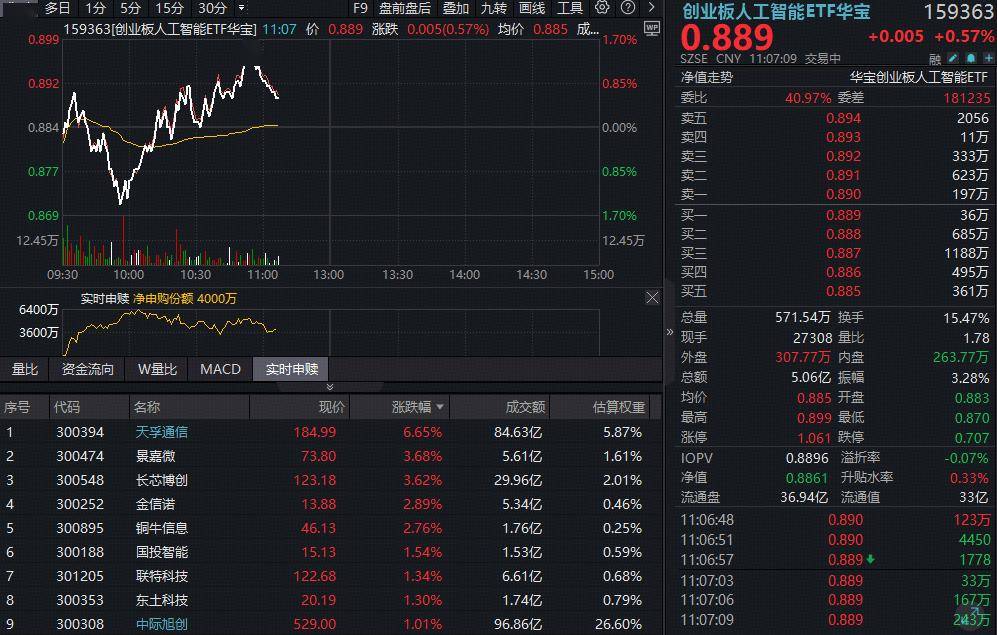 “易中天”接力连涨!创业板人工智能ETF(159363)下探回升逾1%,成交超5亿元领跑同类