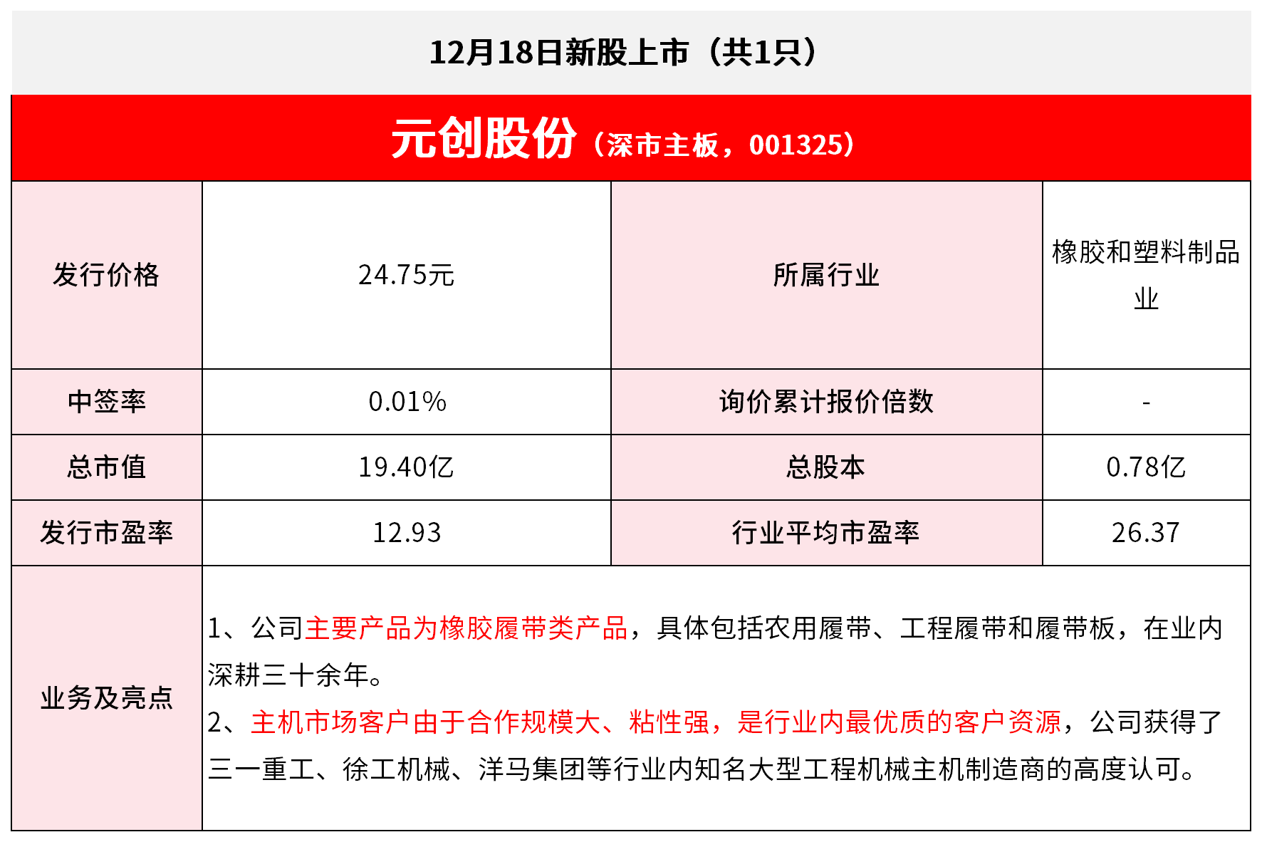 *风险提示:股市有风险,入市需谨慎 | 元创股份(深市主板, 00 | | | | --- | --- | --- | | 发行价格 | 24.75元 | | | 智签率 | 0.01% | 询价 | | 总市值 | 19.40亿 | | | 发行市盈率 | 12.93 | 行」 | | 1、公司主要产品为橡胶履带类产品,具体包括农 | | | | 深耕三十余年。 | 业务及亮点 | | | 2、主机市场客户由于合作规模大、粘性强,是往 | | | | 三一重工、徐工机械、洋马集团等行业内知名大 | | | *免责声明:文章内容仅供参考,不构成投资建议 ...