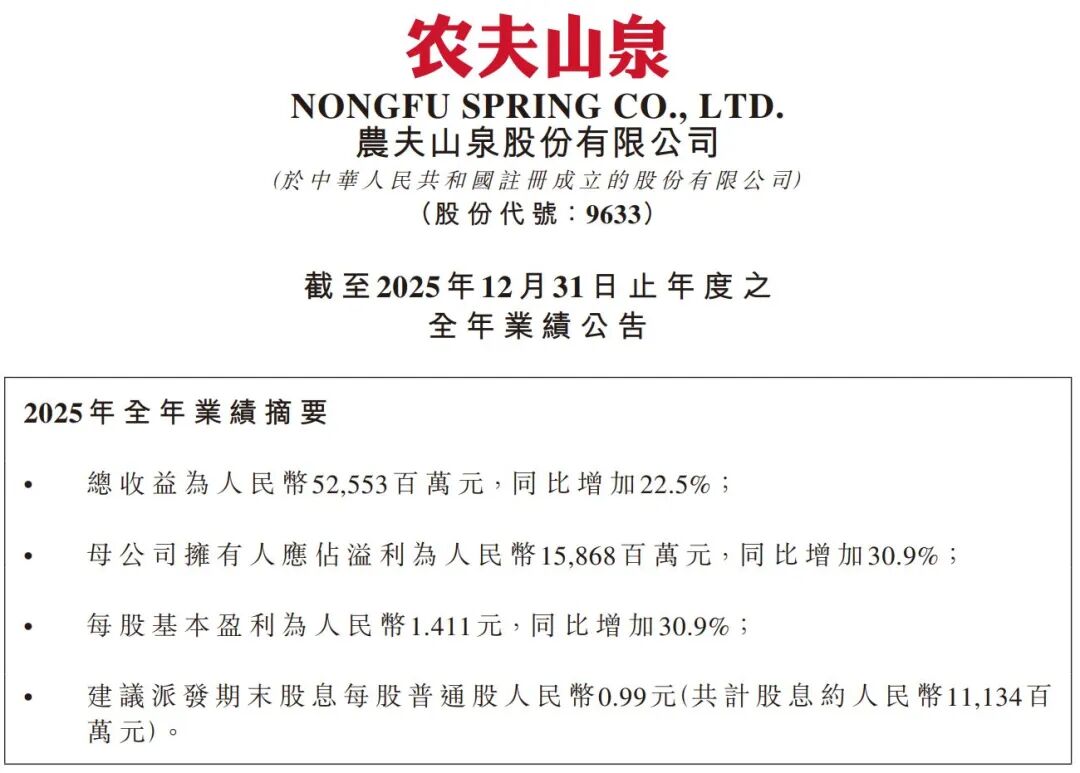 公司2025年财务业绩 - 2025年公司实现总营收525.53亿元,同比增长22.5%,首次突破500亿元大关 [1] - 2025年公司归母净利润为158.68亿元,同比增长30.9% [1] - 2025年公司毛利率为60.5%,较2024年的58.1%提升了2.4个百分点 [10] 包装饮用水业务表现 - 2025年包装饮用水业务营收187.09亿元,同比增长17.3%,从2024年的下滑中恢复增长 [4][8] - 2024年包装饮用水产品收益下滑了21.3%,但公司表示仍稳居中国包装饮用水市场占有率第一 [8] - 公司持续加码水源地布局,2025年新增3个水源地,2026年计划新增1个,目前在全国共布局16大水源地 [5][7] - 水源地建厂模式前期投入大,但能形成稳定网络,例如云南轿子雪山工厂总投资超10亿元 [5][8] 茶饮料业务表现 - 2025年茶饮料产品收益215.96亿元,同比增长29.0%,成为公司收入第一大品类,占总收益比重升至41.1% [10] - 茶饮料与包装饮用水是公司核心业务,两者合计占总营收比重达76.7% [4] - 旗下无糖茶品牌“东方树叶”受益于健康化趋势,无糖饮料市场前景广阔,预计中国无糖饮料市场规模将从2023年的401.6亿元增长至2028年的815.6亿元 [10][11] 公司发展战略与行业竞争 - 公司业绩得益于“水+饮料”双引擎发展格局,水业务是压舱石,茶饮料是新的业绩引擎 [4] - 在激烈的行业竞争中(包括价格战、渠道博弈),公司强调“稳一点、慢一点、远一点”的发展格局 [9] - 公司通过控制电商渠道销售占比(此前大致维持在5%左右)来稳定经销体系价格秩序,从而助力毛利率提升 [10] - 公司将毛利率提升归因于PET、纸箱、白糖等原材料采购成本下降 [10] 品牌与市场反应 - 2024年公司曾受网络舆论影响,董事长钟睒睒称其为“有组织、长时间的连续抹黑和攻击”,但表示这证明了公司的产品品质 [8] - 2025年饮用水业务的恢复被视作市场对农夫山泉品牌的又一次校验 [4] - 2025年年报发布后,公司股价在早盘涨幅达10.84% [4]