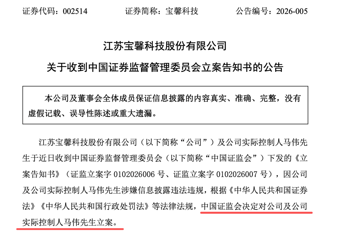 1月30日晚间,又有两家上市公司被证监会立案。 宝馨科技(002514.SZ)1月30日公告称,公司及实控人马伟于近日收到证监会下发的《立案告知书》,因公司及马伟涉嫌信息披露违法违规,根据相关法律 法规,证监会决定对公司及马伟立案。 同时,宝馨科技还披露了业绩预告,2025年预计净亏损6000万元至1亿元,亏损金额有所缩减。 荃银高科表示,2025年度业绩出现亏损的主要原因是2025年度种子行业仍然面临着高库存、同质化严重的激烈市场竞争环境,同时受到自然灾害的影响, 导致公司种子销售价格下行、毛利率下降,同时基于谨慎性原则对应收款项、存货以及商誉等计提了充分的减值准备。 来源:综合上市公司公告 编辑:曹諵 校对:知晏 业绩变动原因主要是,报告期内营业收入同比略有下降,归属于上市公司股东的净利润同比大幅减亏。为应对智能制造板块原有定制设备配件业务订单持 续减少的影响,公司通过研发共享经济领域集成设备,开拓新客户和市场,在第四季度营业收入环比实现较大幅度增长且产品毛利稳定等。 荃银高科也同立案调查公告一同披露了2025年度业绩预报:2025年预计净亏损1.8亿元至2.7亿元。 本文仅供信息分享,不构成对任何人的任 ...