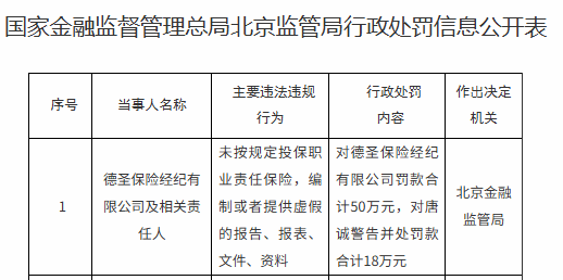 | 序号 | 当事人名称 | 主要违法违规 | 行政处罚 | 作出决定 | | --- | --- | --- | --- | --- | | | | 行为 | 内容 | 机关 | | 1 | | 未按规定投保职 | 对德圣保险经纪 | 北京金融 | | | 德圣保险经纪有 | 业责任保险,编 | 有限公司罚款合 | | | | 限公司及相关责 | 制或者提供虚假 | 计50万元,对唐 | | | | 任人 | 的报告、报表、 | 诚警告并处罚款 | 监管局 | | | | 文件、资料 | 合计18万元 | | 【大河财立方消息】11月9日消息,国家金融监督管理总局北京监管局日前披露的行政处罚信息公开表 显示,德圣保险经纪有限公司因未按规定投保职业责任保险,编制或者提供虚假的报告、报表、文件、 资料,被罚合计50万元。 相关责任人唐诚受到警告并处罚款合计18万元。 德圣保险经纪有限公司官网显示,公司成立于2003年9月,是经中国保险监督管理委员会批准成立的全 国性、综合性保险经纪公司。公司总部设在北京,注册资本金为5000万元人民币,从事中国保监会批准 的所有保险经纪业务,是自主经营、自负盈亏的法人实体。 责 ...