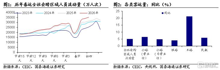 春节出行与消费市场表现 - 2026年春运前19天跨区域人员流动量日均达2.48亿人次,同比增长5.1% [4][5] - 各类客运方式分化显著,水路客运同比增速达21.2%,成为核心增长极,公路营运性客运量同比增长6.5%,民航客运量同比增长5.9% [5] - 出行市场已进入平稳增长新周期,节假日出行增速基本稳定在3%-8%的窄幅区间,需求分布更均衡 [7] - 商品消费表现稳健,假期前四天全国重点零售和餐饮企业日均销售额较2025年同期增长8.6%,重点监测步行街(商圈)客流量、营业额分别增长4.5%和4.8% [9] - 智能产品消费成为亮点,假期前三天重点平台智能穿戴设备销售额增长19.7%,其中智能眼镜增长2.5倍,智能血糖仪增长48.6% [9] - 服务消费中旅游表现亮眼,假期前三天重点平台国内游消费增长4.5%,租车出行订单量增长26%,南北互跨订单量增长196% [10] - 电影消费表现平淡,假期前六天日均观影人次和电影票房较去年下降34.2%和37.6%,呈现量价齐跌 [10] 近期政策聚焦方向 - 政策围绕保内需稳增长、优结构强创新双线发力,兼顾短期与中长期发展 [2][17] - 第一条主线聚焦扩内需,央行明确延续适度宽松货币政策,释放降准降息信号,同时通过优化专项债管理、增加中央投资等举措推动投资止跌回稳 [17] - 第二条主线聚焦优化经济结构,反垄断监管持续加码,出台公用事业、互联网平台反垄断相关规则,加快全国统一电力市场体系建设,并加大科创支持力度 [18] 实体与生产高频数据 - 投资端,专项债发行进度相对较快,但主要国企新签基建合同额同比增速转负,基建资金充裕、项目短缺的情况仍存 [19] - 节前一周水泥、沥青、建筑用钢开工指标均同比负增,受春节假期较长影响,各地建设项目停工较早 [19] - 外贸端表现亮眼,韩国2月前10天进出口受春节错位影响同比高增,半导体相关出口仍是主要支撑,港口离港船舶数和载重吨数农历同比由负转正 [19][21] - 生产端分化,耗煤表现弱于往年同期,节前钢铁、锂电生产边际改善,石化、汽车生产边际走低 [19] 物价与流动性状况 - 物价方面,iCPI指数小幅边际回升,主要受节假日食品烟酒、生活服务涨价驱动,交通通信价格边际走低形成拖累 [21] - 工业品价格大多平稳,南华综合指数基本持平,贵金属价格上涨幅度较大,布油价格接近70美元/桶,铜价小幅回升,碳酸锂、多晶硅价格回落 [21] - 流动性保持合理充裕,2月20日当周央行净投放资金380亿元,R007较前周回落23.0个BP至1.345%,10年期国债收益率回落2.0个BP至1.79% [22] - 人民币持续升值,节前美元兑人民币即期汇率为6.91 [22] 本周重点数据日历 - 2026年2月24日将公布中国贷款市场报价利率(LPR)和中期借贷便利(MLF)操作情况 [25] - 2026年2月26日将公布美国第四季度GDP及PCE价格指数 [25] - 2026年2月27日将公布德国2月CPI和美国1月PPI数据 [25]