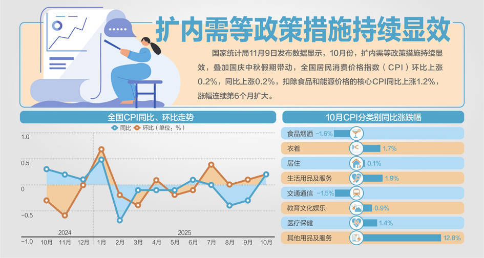 11月9日,国家统计局公布10月物价数据。 数据显示,10月份,居民消费价格指数(CPI)环比上涨0.2%,同比上涨0.2%,扣除食品和能源价格的核心CPI同比上涨1.2%,涨幅连 续第6个月扩大;PPI(工业生产者出厂价格指数)环比由上月持平转为上涨0.1%,为年内首次上涨。 10月PPI年内首次环比上涨,同比降幅进一步收敛。 每日经济新闻 从具体行业看,反内卷相关行业价格普遍修复。光伏设备及元器件制造价格环比上涨0.6%,连续2个多月上涨;同比降幅收窄1.4个百 分点。电池制造价格同比降幅收窄1.3个百分点;锂离子电池制造价格同比由降转涨,上涨0.2%。汽车制造业价格同比降幅收窄0.7个 百分点。水泥制造、计算机整机制造、集成电路制造价格均由降转涨,分别上涨1.6%、0.5%和0.2%。 CPI上涨受益三大因素 CPI环比上涨0.2%,涨幅比上月扩大0.1个百分点且略高于季节性水平;CPI同比由上月下降0.3%转为上涨0.2%。扣除食品和能源价格 的核心CPI同比上涨1.2%,涨幅连续第6个月扩大,为2024年3月以来最高。 东方金诚研究发展部执行总监冯琳认为,10月CPI表现好于季节性背后主要有两个原因 ...