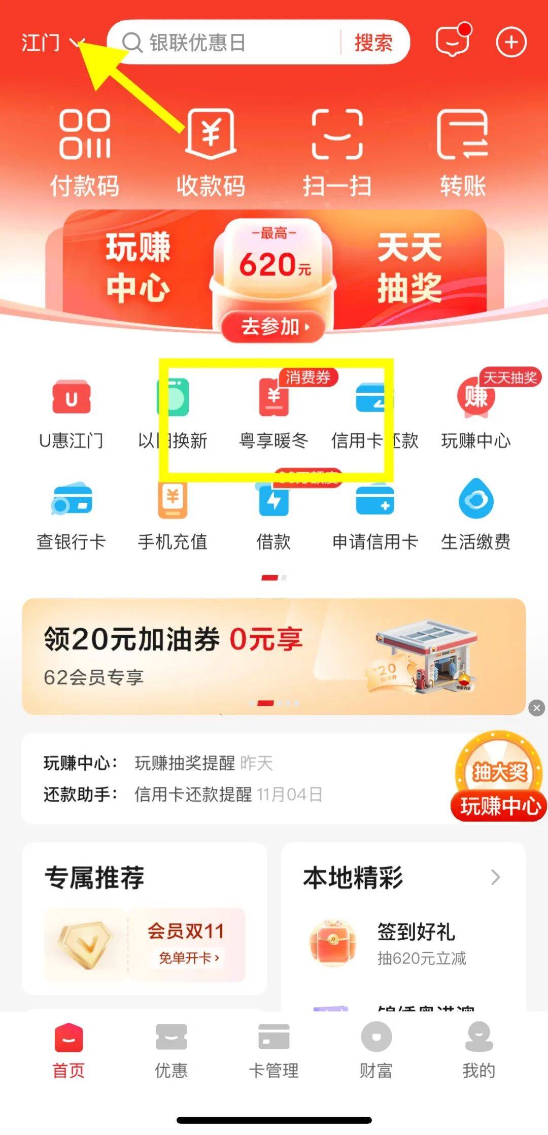 今日聚焦 好消息 "食在江门"餐饮优惠券活动 火热开启啦! 云闪付APP: 1.下载并打开最新版云闪付APP; 2025年11月7日 至2026年3月31日 钱包减负,快乐加倍 想吃就冲,没压力! 首次抢券时间: 2025年11月7日晚上8点 后续抢券时间: 每周逢周二、周五上午10点 哪里领券? 2.打开定位设置,确认云闪付APP左上角定位在"江门市"; 3.点击首页"粤享暖冬"入口,选择"食在广东"进入城市餐饮消费券页面后,点击"食在江门"即可进入活动页面领取消费券; 或点击首页"食在江门"餐饮消 费券轮播图也可直接进入活动页面领取消费券。 借款 查银行卡 手机充值 申请信用卡 生活缴费 领20元加油券 0元享 62会员专享 玩赚中心: 玩赚抽奖提醒 昨天 还款助手: 信用卡还款提醒 11月04日 本地精彩 专属推荐 > 会员双11 签到好礼 抽620元立减 免单开卡 > D 首页 财富 我的 优惠 卡管理 [7] 粤享暖冬 乐游广东 ERMA 玩赚中心 EB 餐饮消费券 官勝冬 乐 立即查看 全运会促消费 立即查看 7 食在广东 食在揭阳 - 一查看详情 · 餐饮消费券 食在惠州 - . 查看详情 · ...