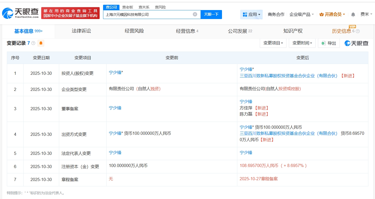 | 都在用的商业查询工具 | | 夏公司 查老板 音关系 音风险 | | | | --- | --- | --- | --- | --- | | 家中心 发展子其全旗下机构 | | 上海次元模因科技有限公司 × 大眼一下 品 应用 ▼ 商务合作 · | | | | 基本信息 999+ | | 经营风险 法律诉讼 经营信息 4 公司发展 22 | | 知 | | 工商信息 ● | | | | | | 工商信息 | 历史 商信息0 | | | | | 企业名称 | | 上海次元模因科技有限公司 | | | | 法定代表人 | Th | 登记状态 ② 存续 宁少锋 天眼评分 2 | | | | | | 成立日期 2025-09-11 | | | | 统一社会信用代码 2 | | 91310115MAEUEFW35J 注册资本 2 实缴资本 108.6957万人民币 益 | | | | 工商注册号 | | 310141000934976 纳税人识别号 2 91310115MAEUEFW35J | 组织机构代码(1 | | | 营业期限 | | 2025-09-11 至 无固定期限 纳税人资质 核准日期 | | | | ...